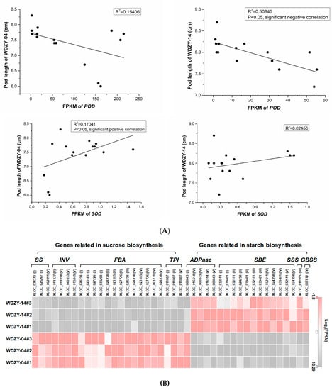 (A) The correlations between the expression level of POD, SOD, and pod length. (B) The expression pattern of the key genes involved in sucrose and starch synthesis.