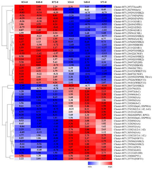 | Cluster-4871.211143 | K14506 | Jasmonic acid-amino synthetase (JAR1) | −0.27 | −0.03 | 0.38 | −1.62 | −1.73 | −1.90 | |