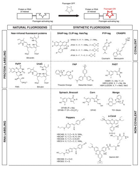 Examples of fluorogens found in fluorogen-based reporters and biosensors. Proteins and RNA of interest can be fluorescently labeled in a selective fashion through fusion to tags that (covalently or non-covalently) bind (natural or synthetic) fluorogens and activate their fluorescence.