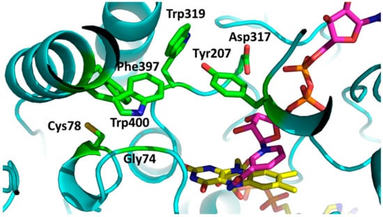 - Orru, R.; Pazmiño, D.E.; Fraaije, M.W.; Mattevi, A. Joint functions of protein residues and NADP(H) in oxygen activation by flavin-containing monooxygenase. J. Biol. Chem. 2010, 285, 35021–35028. [Google Scholar] [CrossRef] [PubMed]