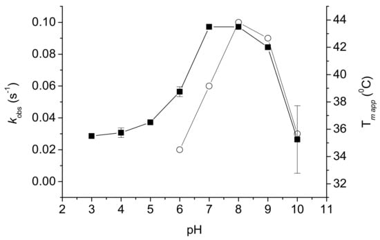 The effect of pH on the activity and stability of PTDH-*mFMO. (○)-activity (s−1), (■)-stability as melting temperatures (°C).