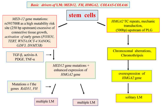 The main genetic drivers of LM include the MED12, HMGA2, FH, and COL4A5-COL4A6 genes [].