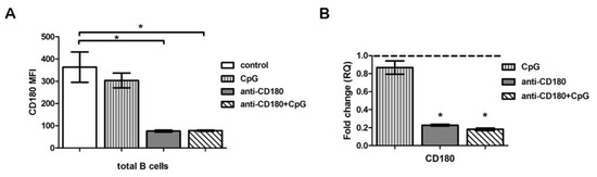 2.2. TLR Ligation Results in Reduced CD180 mRNA and Protein Expression of B Cells