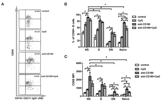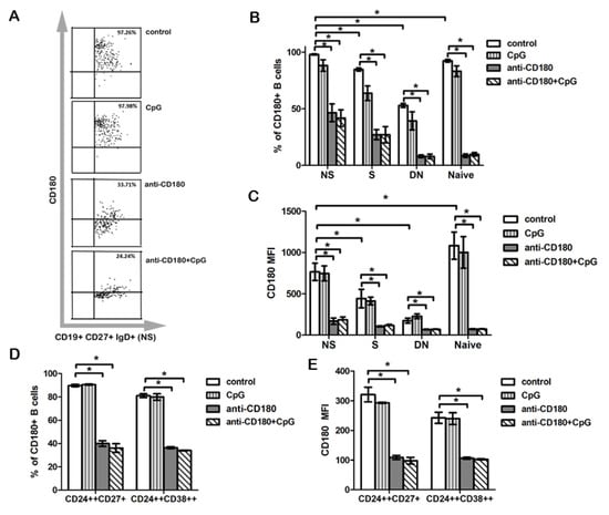 2.3. The Frequency of CD180+ Cells Is the Highest in the Non-Switched Memory B Cell Subset