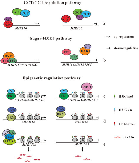Regulation pathway of MIR156 gene expression in Arabidopsis. (a) GCT/CCT regulate expression of MIR156 genes through competitive interactive with unknown transcript factor, inactivating RNA polymerase II. (b) Under low sugar conditions (left), HXK1 transcript complex bind into promoter of MIR156A/MIR156C. Then glucose incorporate with HXK1 (right), inhibiting MIR156 gene expression. (c) The decreases in the expression of MIR156A/MIR156C are regulated by the levels of histone H3 lysine 27 methylation (H3K27me3). PKL reduces the amount of H3K27ac continuously with a histone deacetylase (X). PRC2 binds to the promoter of MIR156 gene then methylates H3K27 when the levels of H3K27ac no longer inhibiting PRC2 binding. (d) BRM activates MIR156A/MIR156C expression by decreasing levels of H3K27me. Then SWN bind to BRM, releasing BRM from the promoter of MIR156A/MIR156C to increase H3K27me abundance leading to repression of miR156 expression. (e) At the initial juvenile phase, ARP6 interacts with SEF, exchanging H2A to H2A.Z, which is the deposition of H3K4me3 at the promoter region of MIR156 locus with the help of ATXR7.