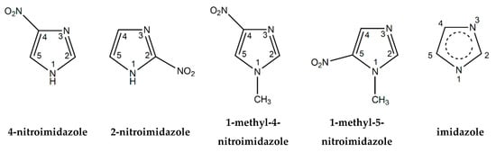 Molecular structure of 4-nitroimidazole (4NI), 2-nitroimidazole (2NI), 1-methyl-4-nitroimidazole (Me4NI), 1-methyl-5-nitroimidazole (Me5NI) and imidazole (IMI).