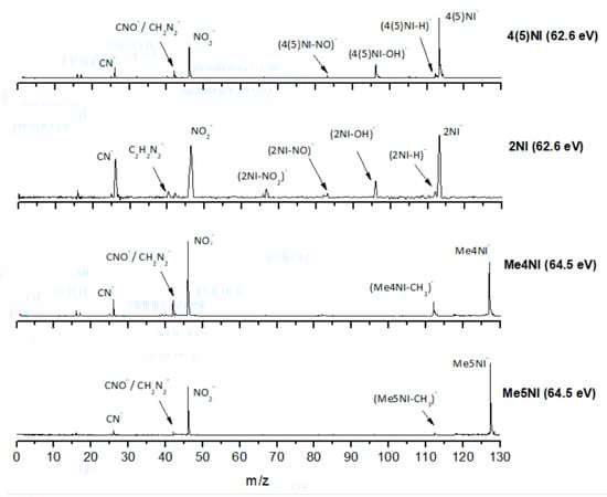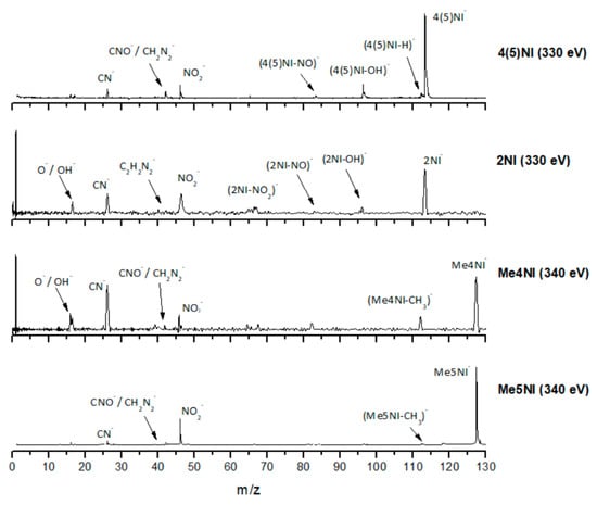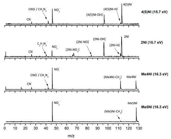 In DEA studies, the parent anion formation is not observed in 4(5)NI, but in Me4NI and Me5NI [,]. Tanzer et al. have shown that the parent anion in Me4NI and Me5NI are formed within a resonance close to 0 eV. This was explained based on the assumption that the energy involved in the electron-molecule system, consisting of the energy of the incoming electron and the electron affinity of the molecule, is transferred to the vibrational degrees of freedom of the TNI, which delays autodetachment, resulting in a long-lived TNI in the μs time scale detection window. These molecules also have positive electron affinities which means that the ground state of the anion lies below the neutral molecule. Molecules with positive electron affinities lead to formation of stable anions where the extra electron is in a bound state []. Following this rationale, observation of the parent anion for all molecules is not surprising.
