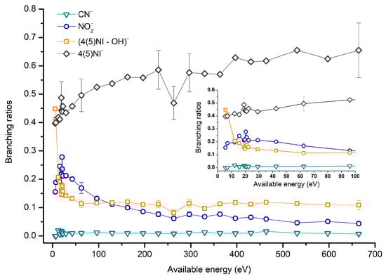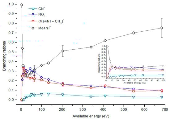 The parent anion formation from all nitroimidazole molecules is one of the most remarkable processes observed in these experiments, especially for high impact collision energies. The BRs as a function of the available energy (Figure 5, Figure 6 and Figure 7) show that the parent anion is formed for all energies and, in the case of 4(5)NI, represents the most intense anion yield between 5.7 eV and 664 eV available energy. At higher collision energies, 4(5)NI− accounts for ~60% of the total anion yield, whereas methylation at the N1 position in Me4NI and Me5NI enhances parent anion formation up to ~70% and ~60% of total anion yield. However, for Me5NI at energies between 6 and 13 eV the most intense fragment is (Me5NI–CH3)−, and for Me4NI at energies between 16 and 51 eV the most intense anion is NO2−.