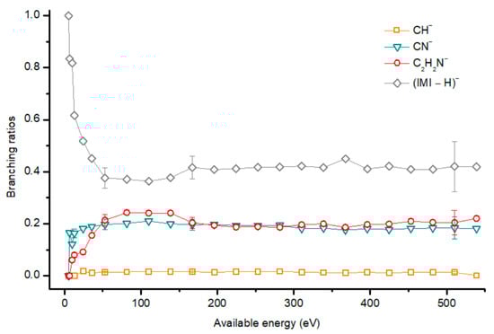 The most intense anionic fragment detected in K-imidazole collisions in the wide energy range (15 to 1000 eV) investigated, is the dehydrogenated parent anion, (IMI−H)− (Figure 8 and Figure 9). The BR for (IMI−H)− shows that it decreases from 5.4 eV (17 eV lab frame) to 52.8 eV (100 eV lab frame) where it reaches a plateau contributing to ~40% of the total anion yield. In Figure 9 it is also noticeable that for other fragments such as CN− and C2H2N− their BRs increase in the energy region where the (IMI−H)− yield decreases. This demonstrates that the hydrogenated parent anion may be a precursor in the formation of other anions. This behavior was already shown in electron transfer collisions in neutral potassium atoms with adenine [], a molecule that is formed by a pyrimidine and an imidazole ring. Formation of (IMI−H)− can occur from the cleavage of an C−H or N−H bond, represented as: