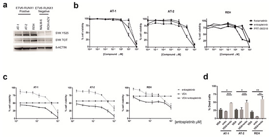The following are available online at https://www.mdpi.com/1422-0067/20/24/6175/s1, Table S1: Combination Index (CI) values in AT-1, AT-2 and REH cell lines. Table S2: CI values in AT-1, AT-2 and REH cell lines. Figure S1: SYK Y525/Y526 phosphorylation measured by phosphoflow. Figure S2: Sensitivity of AT-1, AT-2 and REH cells to the conventional chemotherapeutic compounds. Figure S3: Western blot for mTOR pathway in AT-1 cell line treated with entospletinib. Figure S4: SYK mRNA expression in ETV6-RUNX1 patients. Figure S5: Phosphorylation of SYK Y525/526 in primary cells. Figure S6: Gating strategy used in phospho-flow cytometry analysis.
