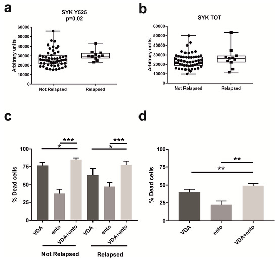 - Boros, K.; Puissant, A.; Back, M.; Alexe, G.; Bassil, C.F.; Sinha, P. Increased SYK activity is associated with unfavorable outcome among patients with acute myeloid leukemia. Oncotarget 2015, 6, 25575–25587. [Google Scholar] [CrossRef] [PubMed]
