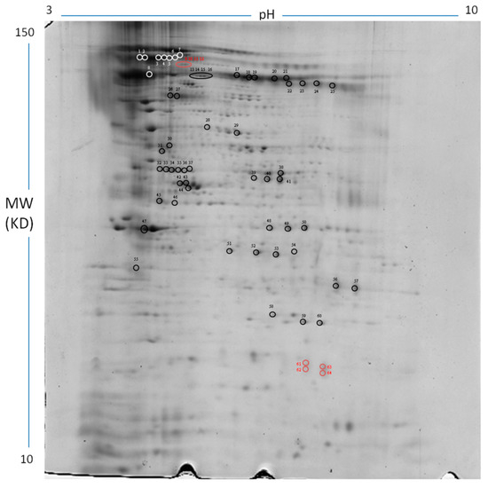 Representative image of a 2D gel of equine chondrocytes obtained using linear IPG (immobilized pH gradient) strip 3–10 and 12% T SDS-PAGE. The differentially represented protein spots (fold change > 2 and p < 0.05) were marked and numbered. Corresponding identified proteins are listed in Table 1. Spots found in OC and Control gels are marked in black and white circles, while spots found in OC gels only are marked in red circles.