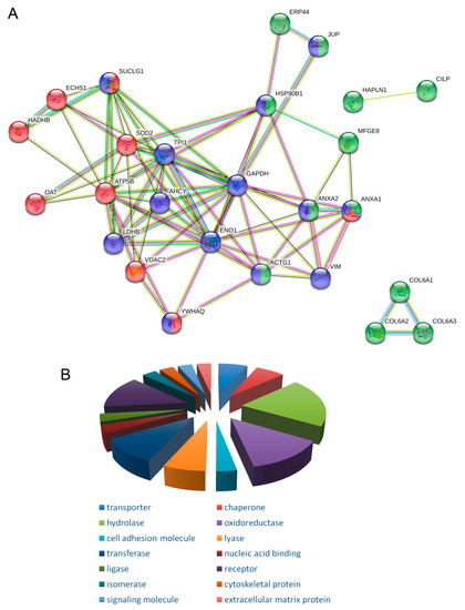 (A) STRING Protein Protein Interaction (PPI) analysis of differentially expressed proteins in OC, nodes colors are in accordance with cell component categories: green = extracellular regions (GO:005576); red = mitochondrion (GO:005739); blue = cytosol (GO:005829); (B) PANTHER analysis classified the proteins identified according to the corresponding “Protein Class”.