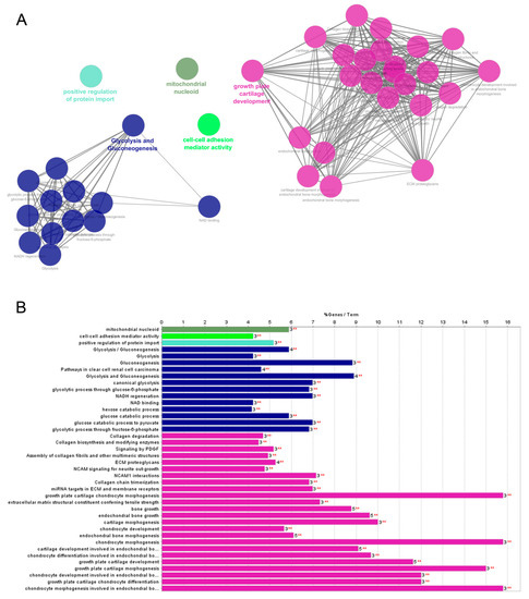 The two Cytoscape plugins, ClueGO and the CluePedia, were used to investigate the functionally grouped networks of deregulated proteins in OC in detail. In particular, biological processes, molecular functions, cellular component, Reactome, Kyoto Encyclopedia of Genes annotations and Genomes (KEGG), and WikiPathways were integrated. The κ score level was set at ≥0.4. The statistically significant (p < 0.05) enrichment terms are shown in Figure 3A. The most significant functional groups evidenced were glycolysis and gluconeogenesis, growth plate and cartilage development, positive regulation of protein import, cell–cell adhesion mediator activity, and mitochondrion nucleoid. All functional groups/pathway terms and the relative percentage (%) of deregulated genes in OC are shown in Figure 3B.
