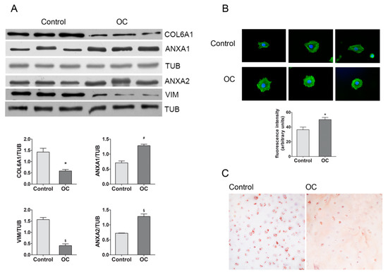 Validation of a panel of five proteins found to be modulated in equine OC cells using different approaches. (A) Representative images of Wester Blotting of vimentin (VIM), annexin A2 and A1 (ANXA1-2), and collagen VI alpha 1 chain (COL6A1), as well as tubulin (TUB), which were used as housekeeping proteins. The bar graph shows normalized Western blot band densities. Images of independent blots were acquired and quantified using Quantity One Software. Data represent the mean ± SEM of three independent experiments. (* p = 0.01; # p = 0.0018; $ p = 0.001; § p = 0.0027). (B) Actin analysis by fluorescent phalloidine of Control and OC cells (scale bar 50 μm), seeded on glass slips. Data represent the mean ± SEM of 3 independent experiments. (C) Immunohistochemistry of equine cartilage samples (from the lateral trochlear ridge of femur) for COL6A1 (characterized by pericellular immunolabeling) (magnification 200×).