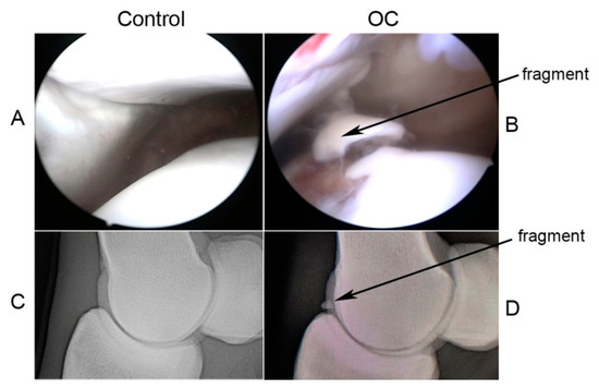 Representative images of healthy (Control) and OC equine joint. (A,B) Control and OC lateral trochlear ridge of the femur with fragment obtained during arthroscopy. (C,D) Lateromedial radiographic images of healthy (Control) and OC metacarpophalangeal joint with OC fragment of the dorsoproximal aspect of the proximal phalanx.