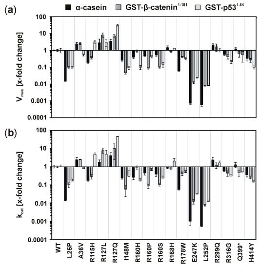 Remarkably decreased kinase activity could be observed for GST-CK1δ mutants carrying mutations I148M, R160H, R160P, R160S, R168H, R178W, E247K, or L252P. Interestingly, for mutants CK1δ