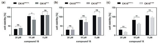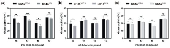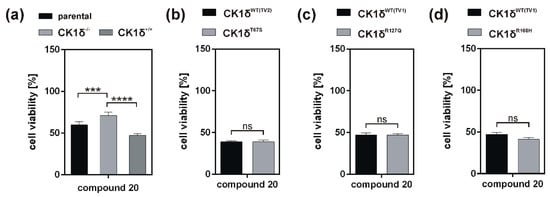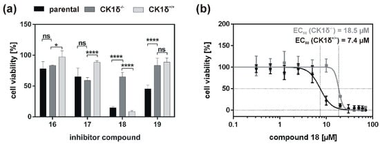 If the hyperactive CK1δ mutants T67S, R127Q, and R168H were expressed in HeLa CK1δ−/− cells, inhibitory effects mediated by compound 18 were slightly stronger. This finding underlines the marginally increased affinity of compound 18 to CK1δ mutants in comparison to wild type CK1δ. Interestingly, for all three mutant-expressing cell lines, dose-dependently different effects could be observed, thereby demonstrating the need for proper dose-response investigation.