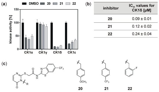 22 could be significantly improved concerning their inhibitory effects on CK1δ. Because highly potent inhibitors of CK1 isoforms could be used for the treatment of proliferative diseases, the highly potent inhibitors