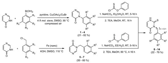 The appropriate phenyl/benzyl- pyrimidinone derivative and NaHCO3 were dissolved in a mixture of organic solvent and deionized water under vigorous stirring. Phenyl thionochloroformate was added dropwise and the mixture was stirred at room temperature for 5–16 h. After extraction with ethyl acetate the organic phase was washed three times with brine, dried over sodium sulfate and the solvent was removed under reduced pressure. The residue was then dissolved in methanol. TEA was added and the mixture was stirred at room temperature (or at 80 °C) for 4–16 h. The solvent was removed and the crude products were purified by column flash-chromatography on silica gel (gradient EE/PE).