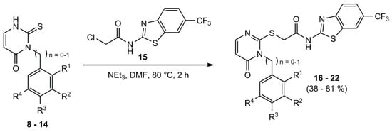Under nitrogen atmosphere the appropriate phenyl/benzyl-2-thioxo-pyrimidinone-derivative and 15 were dissolved in DMF. TEA was added and the mixture was heated to 80 °C for 2 h. After quenching with water, the reaction mixture was extracted with ethyl acetate. The organic phase was washed respectively with deionized water and brine three times and dried over sodium sulfate. The solvent was removed under reduced pressure and the crude product was purified by column flash-chromatography on silica gel (gradient EE/PE) or by recrystallization from EtOH/H2O.