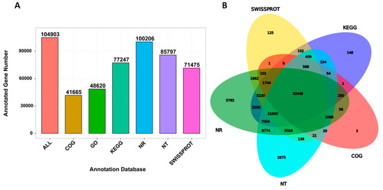 - Grabherr, M.G.; Haas, B.J.; Yassour, M.; Levin, J.Z.; Thompson, D.A.; Amit, I.; Adiconis, X.; Fan, L.; Raychowdhury, R.; Zeng, Q.; et al. Full length transcriptome assembly from RNA Seq data without a reference genome. Nat. Biotechnol. 2011, 29, 644–652. [Google Scholar] [CrossRef] [PubMed]