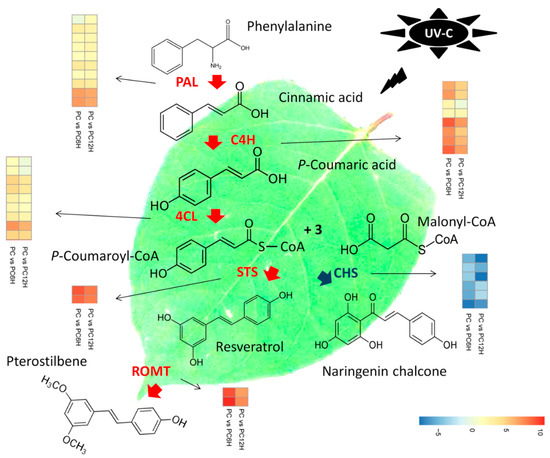 - Yin, X.; Singer, S.D.; Qiao, H.; Liu, Y.; Jiao, C.; Wang, H.; Li, Z.; Fei, Z.; Wang, Y.; Fan, C. Insights into the Mechanisms Underlying Ultraviolet-C Induced Resveratrol Metabolism in Grapevine (V. amurensis Rupr.) cv. “Tonghua-3”. Front Plant Sci. 2016, 7, 503. [Google Scholar] [CrossRef]