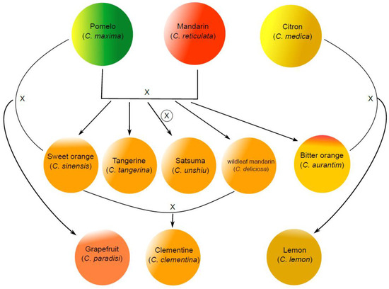 It was suggested that the Citrus genus originated from the Malay Archipelago and Southeast Asia, and the varieties of edible citrus fruits on the market are generated by hybridizations of ancestral species, natural or artificial mutations, and human selection during domestication [1,2]. The genealogy and genetic origin of the major citrus species are roughly summarized in Figure 1. The major ancestral species largely include mandarin (Citrus reticulata), pomelo (Citrus maxima), and citron (Citrus medica). The classification of commercial mandarins is very complicated, which largely include tangerine, satsuma, and clementine. Citrus hybrids are more diversified, and their taxonomy is somewhat inconsistent. The major hybrids as our common consumption include sweet orange (Citrus sinensis), bitter orange (Citrus aurantim), grapefruit (Citrus paradisi), lemon (Citrus limon), and limes [3]. Orange is a hybrid between pomelo and mandarin, and grapefruit is the product of a natural backcross of a sweet orange with a pomelo [4]. The original lemon is a hybrid of bitter orange and citron, while lime is highly diverse including several species. According to the Food and Agriculture Organization of the United Nations (FAO) citrus fruits statistics 2017 (FAO statistics, 2017), citrus fruit accounts for about 17% of total fruit production, in which about 50% and 23% of citrus fruits are orange and mandarins, respectively.