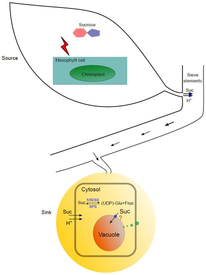 Schematic illustration of sucrose transport from source to sink in citrus. Sucrose is biosynthesized in leaf mesophyll cells through photosynthesis. The translocate sucrose is loaded to the sieve cells of phloem using H+ electrochemical potential gradient as driving force with the help of H+/sucrose symporter. Sucrose is transported in phloem following the turgor pressure in sieve elements towards sink tissue (citrus fruit) and unloaded by the symplastic or apoplastic pathway. Sucrose can be converted to fructose and glucose by IVR or fructose and UDP-glucose by SS, and it can be resynthesized through fructose and UDP-glucose by SPS in the cytosol. Sucrose uptake from apoplastic into cytosol is driven by the H+/sucrose symporter. The apoplastic sucrose can be directly incorporated into vacuole through endocytosis system, while the existence of an active transporter or H+/sucrose antiporter from cytosol to vacuole is still questioning. IVR—invertase; SS—sucrose synthase; SPS—sucrose-phosphate synthase.