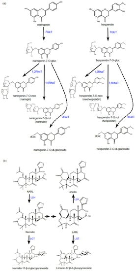 Flavanone glycosylation pathways, and limonoid aglycon or glycon formation pathways. (a) Two major flavanone compounds, naringenin and hesperitin, in citrus are exemplified. They can be converted to their glucoside derivatives at their C7 site by 7GlcT (7-glucose transferase), and further rahmnosylated on glucoside through C1,2 or C1,6 bond formation between rhamnose and glucose catalyzed by 1,2RhaT or 1,6RhaT, respectively. Consequently, the glycosylation of flavanone by neohesperidose (rhamylose-1,2-glucose) leading to the formation of naringin and neohesperidin confers bitterness and the glycosylation by rutinose (rhamylose-1,6-glucose) leading to the formation of narirutin and hesperidin confers non-bitterness. Flavanone-7-O-gluc can also be further glucosylated to form flavanone-7-O-di-glucocide (glucose-1,2-glucose as proposed) catalyzed by dGlcT; (b) Two major limonoid compounds, nomilin and limonin, in citrus are exemplified. Non-bitter NARL and LARL precursors can be converted to bitter-tasting nomilin and limonin, respectively, by LLH under acidic condition. Nomilin can be converted to LARL through multiple steps. Nomilin and LARL can also be converted to the non-bitter derivatives of nomilin-17-O-glucoside and limonin-17-O-glucoside, respectively, catalyzed by LGT. NARL—nomilioate A-ring lactone; LARL—limonoate A-ring lactone; LLH—limonoid D-ring lactone hydrolase; LGT—limonoid glycosyltransferase.