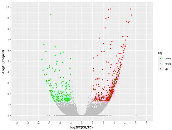 Volcano plot of the DEGs (differentially expressed genes) between the control group (CG) and the Bisphenol A (BPA) treatment group (TG). Log2FC (CG/TG) indicates the mean expression level (log2 fold change) for each gene. Each dot represents a gene. The red dots represent upregulated genes, green dots represent downregulated genes, and gray dots represent genes that were not differentially expressed.