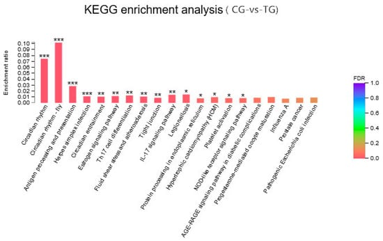 Enriched KEGG terms for the DEGs between the control group (CG) and the BPA treatment group (TG). * indicates a significant difference at p < 0.05, ** indicates a significant difference at p < 0.01, and *** indicates a significant difference at p < 0.001.