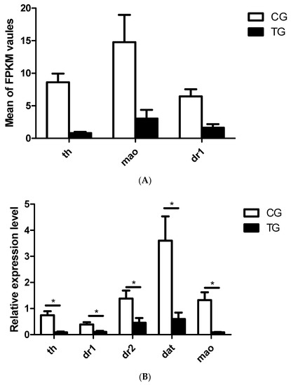 DEGs in the dopaminergic signaling pathway and analysis of the expression of dopaminergic signaling pathway-related genes by qRT-PCR. (A) Expression levels of 3 DEGs in the dopaminergic signaling pathway from the transcriptome data. (B) Expression levels of 6 dopaminergic signaling pathway-related genes determined by qRT-PCR (n = 3). CG: Control group; TG: BPA treatment group; and FPKM: Fragments per kilobase of transcript per million mapped reads. The qRT-PCR results were calculated from at least three independent experiments. EF1 was used as an internal normalization control. The data are expressed as the mean ± SD (* p < 0.05).