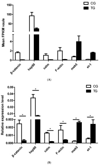 DEGs in the fluid shear stress and atherosclerosis pathway and validation by qRT-PCR. (A) Expression levels of 6 DEGs in the fluid shear stress and atherosclerosis pathway from the transcriptome data. (B) Validation of DEGs in the fluid shear stress and atherosclerosis pathway by qRT-PCR (n = 3). CG: Control group; TG: BPA treatment group; and FPKM: Fragments per kilobase of transcript per million mapped reads. The qRT-PCR results were calculated from at least three independent experiments. EF1 was used as an internal normalization control. The data are expressed as the mean ± SD (* p < 0.05).