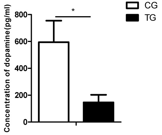 Serum dopamine concentrations in the control group (CG) and the BPA treatment group (TG). The data are expressed as the mean ± SD (n = 3); * indicates a significant difference at p < 0.05.