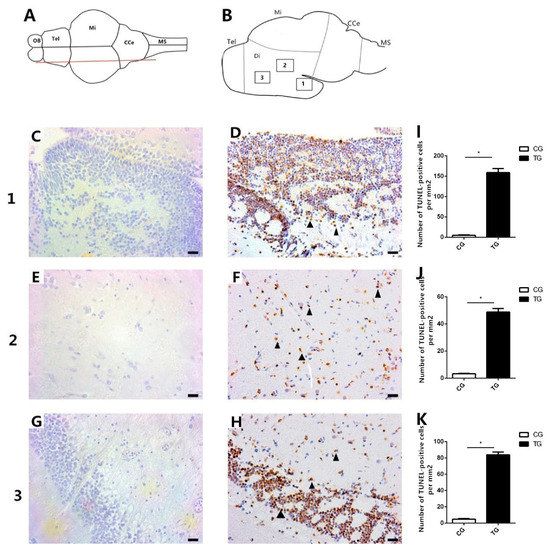 TUNEL staining of the brains of goldfish in the control group (0 μg L−1) and the BPA treatment group (50 μg L−1). (A) Dorsal view of the fish brain; the red line represents the slice position. (B) Longitudinal sectional view of the fish brain; the boxed areas represent the positions of the sections. (C–H) TUNEL staining of brain Section 1, Section 2, and Section 3. No TUNEL-positive signals were detected in the control group in the three positions (C,E,G). (D,F,H) TUNEL-positive signals were detected in all three positions in the BPA-exposed group (black arrowheads). (I–K) Statistical analysis of the number of TUNEL-positive cells per mm2. Five images per fish were analyzed. * indicates a significant difference (n = 3). Tel: Telencephalon; OB: Olfactory bulb; Di: Diencephalon; Mi: Midbrain; CCe: Corpus cerebelli; and MS: Medulla spinalis. Scale bars, 50 μm.