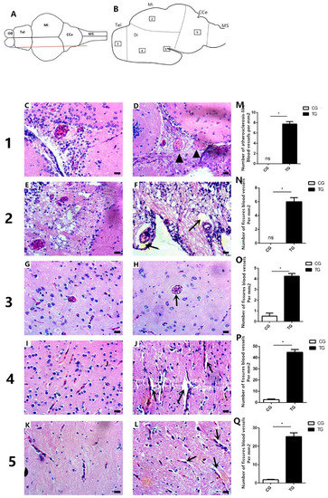 Histology of the brains of goldfish from the control group (0 μg L−1) and the BPA treatment group (50 μg L−1). (A) Dorsal view of the fish brain; the red line represents the slice position. (B) Longitudinal sectional views of the fish brain; the boxed areas represent the positions of the sections. (C–L) Histology of the brain in the five areas. (C,E,G,I,K) Brain histology of the five areas in the control group. (D,F,G,J,L) Brain histology of the five areas in the BPA-exposed group. Atherosclerosis was found in the diencephalon (black arrowheads) in the BPA-exposed group (D). Fissures (black arrows) were found in the midbrain (F) and telencephalon (G) region, as well as in capillaries in the telencephalon (J) and corpus cerebelli (L). (M) Statistical analysis of the number of fissured blood vessels per unit area. * indicates a significant difference (n = 3). (N–Q) Statistical analysis of the number of atherosclerosis-like vessels per mm2. Five images per fish were analyzed. * indicates a significant difference (n = 3). Tel: Telencephalon; OB: Olfactory bulb; Di: Diencephalon; Mi: Midbrain; CCe: Corpus cerebelli; and MS: Medulla spinalis. Scale bars, 50 μm.