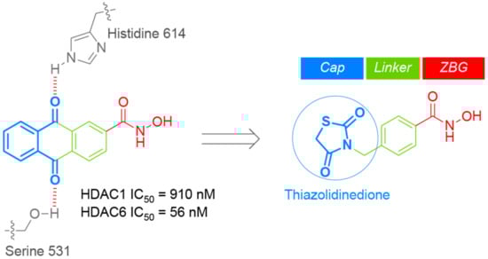 We previously performed a structure-based virtual screening and discovered a novel class of anthraquinone-based HDAC6 inhibitors with a good HDAC6 selectivity over other HDAC isozymes (Figure 1) []. We found out that two carbonyl oxygens of anthraquinone played a pivotal role in exhibiting selective inhibition of HDAC6. These carbonyl groups recognized the unique rim and surface area of HDAC6, which is different from other HDAC isozymes. Despite the fact that this anthraquinone-based HDAC6 inhibitor displayed an excellent in vitro biological activity, its intrinsic poor solubility hampered further study for in vivo application. Thiazolidinedione (TZD) is a five-membered ring molecule containing two heteroatoms (nitrogen and sulfur) and two carbonyl groups. Thiazolidinedione and its derivatives have diverse biological activities including anti-microbial, anti-oxidant, anti-inflammatory, anti-diabetic, anti-cancer, and anti-tubercular activities, and a number of thiazolidinedione-based drugs, such as troglitazone and rosiglitazone, have been clinically approved for the treatment of type 2 diabetes [,]. The fact that thiazolidinedione is a privileged scaffold from clinically approved drugs with two carbonyl groups prompted us to explore the thiazolidinedione-based HDAC6 inhibitors.
