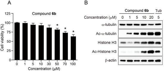 We next evaluated the effect of compound 6b on the cell viability of SH-SY5Y, which is a human neuroblastoma cell line (Figure 2). Although the exposure of SH-SY5Y cells with high concentrations (50, 70, and 100 µM) of 6b decreased the cell viability of SH-SY5Y in a dose-dependent manner, compound 6b exhibited no cytotoxic effect on cell viability up to 30 µM concentration. It has been well-reported that selective inhibition of HDAC6 isoform did not produce a lethal effect on cell viability, in contrast to inhibition of class I HDAC enzymes.