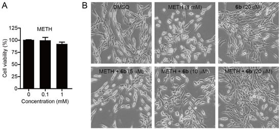 Effect of methamphetamine (METH) and compound 6b on the cell morphology and viability of SH-SY5Y cells. (A) Effect of methamphetamine on the cell viability of SH-SY5Y. Cells were incubated with the indicated concentrations of methamphetamine (METH) for 24 h and cell viability was measured using the colorimetric MTS assay. Data are presented as mean ± SD (n = 4). (B) Bright-field images of SH-SY5Y cells. Cells were pretreated with methamphetamine (METH, 1 mM) for 4 h and then incubated with the indicated concentrations of compound 6b for 24 h.
