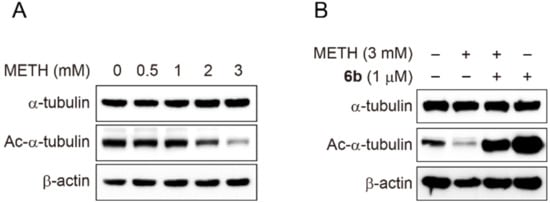 Western blot analysis of α-tubulin acetylation status after the treatment with methamphetamine (METH) and compound 6b. (A) SH-SY5Y cells were incubated with the indicated concentrations of methamphetamine (METH) for 24 h and the expression levels of Ac-α-tubulin and α-tubulin were analysed by Western blot. β-actin was used as a loading control. (B) SH-SY5Y cells were pretreated with methamphetamine (METH, 3 mM) for 4 h before exposure to compound 6b (1 µM) for 24 h. The expression levels of Ac-α-tubulin and α-tubulin were analysed by Western blot. β-actin was used as a loading control.