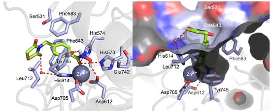Additionally, the carbonyl oxygen (C=O) of the hydroxamate formed two hydrogen bonds with the side chain of His573 and His574, while the hydroxyl (OH) group and amine (NH) group of the hydroxamate formed hydrogen bonds with Asp612 and Tyr745, respectively. The middle phenyl ring of compound 6b were nicely positioned in the hydrophobic channel, forming π−π interactions with the lipophilic side chains of Phe583 and Phe643 residues. Thiazolidinedione ring was located in the rim of the substrate binding pocket, in that one carbonyl oxygen (C=O) of thiazolidinedione ring formed a hydrogen bonding interaction with a conserved water molecule and the hydrophobic sulfur and carbon atoms at the 1 and 5 position of the thiazolidinedione ring formed proximal Van der Waals interactions with the lipophilic side chain of Leu712. Collectively, the docking study illustrated that compound 6b well fitted into the active site of HDAC6 with diverse intermolecular interactions such as zinc chelation, hydrogen bonds, π−π interactions, and Van der Waals interactions and the estimated binding energy of compound 6b resulted in −7.02 kcal/mol.