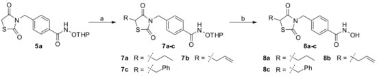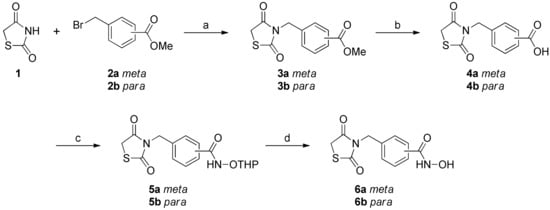 The synthesis of thiazolidinedione-based HDAC6 inhibitors 6a-b is illustrated in Scheme 1. The key intermediate 3a-b were synthesized following the previously reported procedure []. Briefly, the base-promoted N-alkylation reaction of thiazolidine-2,4-one (1) with methyl 3-(bromomethyl)benzoate (2a) or methyl 4-(bromomethyl)benzoate (2b) successfully provided compounds 3a-b in 53–55% yields. The initial attempt to directly convert ester 3a-b to hydroxamate 6a-b using hydroxylamine in the presence of sodium hydroxide in methanol was not fruitful due to the instability of thiazolidine-2,4-one ring in this reaction condition. That led us to follow an alternative synthetic route. Therefore, compound 3a-b were hydrolyzed into carboxylic acid 4a-b in the aqueous acidic condition. Having prepared carboxylic acid 4a-b, we then performed amide coupling reaction of 4a-b with NH2OTHP using EDC, HOBt, and TEA in DCM, which provided compound 5a-b in 43–57% yields. Finally, the removal of THP-protecting group from compound 5a-b was accomplished by the acidic hydrolysis and successfully afforded compound 6a-b in 36–42% yields.