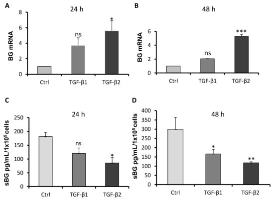 Since BG is an important co-receptor especially for TGF-β2 [,], we first sought to determine if TGF-βs modulate BG mRNA expression and shedding in Sertoli cells. For this purpose, we isolated mRNAs and supernatants from 93RS2 Sertoli cells treated with TGF-β1 or TGF-β2 for 24 h or 48 h. We found that TGF-β2, in particular, significantly increased mRNA expression of BG after 24 h as well as after 48 h (Figure 1A,B). Furthermore, both TGF-β1 as well as TGF-β2 reduced shedding of BG after 48 h significantly compared to untreated controls (Figure 1C,D).
