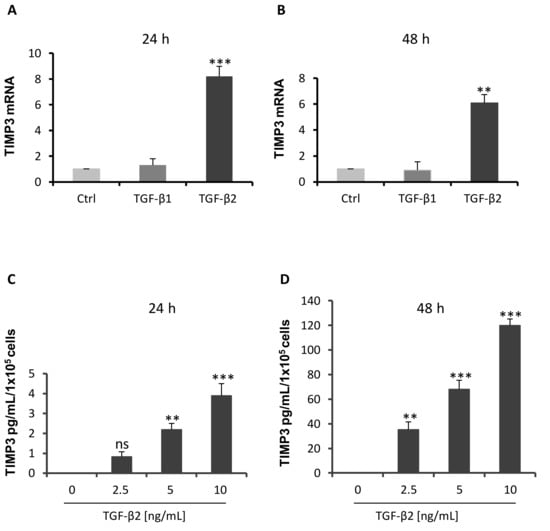 TGF-β2 treatment induces TIMP3 mRNA and secretion. The 1 × 105 93RS2 cells/well were incubated with TGF-β1 or TGF-β2 (both 10 ng/mL) for (A) 24 h or (B) 48 h and the mRNA expression of TIMP3 measured with qRT-PCR. Only TGF-β2 stimulated TIMP3 mRNA expression significantly given as fold change of control. 1 × 105 93RS2 cells/well were incubated with TGF-β2 for (C) 24 h or (D) 48 h. Supernatants were analyzed for TIMP3 by ELISA. TGF-β2 stimulated secretion of TIMP3 dose-dependently and significantly. Each bar represents the mean ± SEM of 3 independent experiments performed in duplicate. Dunnett’s test was used for statistical analysis; **p < 0.01, ***p < 0.001, ns = not significant.
