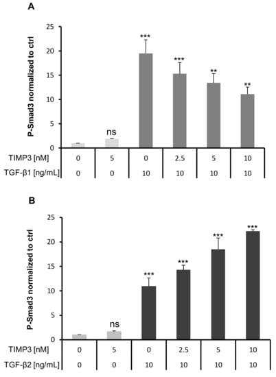 Effects of TIMP3 on Smad3 phosphorylation in TGF-β1/2 signaling. The 7 × 104 93RS2 cells/well were incubated with different doses of TIMP3 for 2 h and then treated with (A) TGF-β1 or (B) TGF-β2 (both 10 ng/mL) for 2 h. Cell lysates were analyzed for p-Smad3 by ELISA. TIMP3 only increased phosphorylation of Smad3 together with TGF-β2 (B) dose-dependently and significantly. Each bar represents the mean ± SEM of 3 independent experiments performed in duplicate. Dunnett’s test was used for statistical analysis; **p < 0.01; ***p < 0.001, ns = not significant.