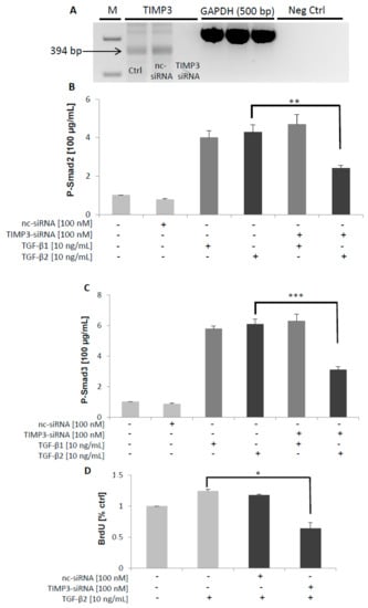 - Leivonen, S.K.; Lazaridis, K.; Decock, J.; Chantry, A.; Edwards, D.R.; Kähäri, V.M. TGF-β-elicited induction of tissue inhibitor of metalloproteinases (TIMP)-3 expression in fibroblasts involves complex interplay between SMAD3, p38α, and ERK1/2. PLoS ONE 2013, 8, e57474. [Google Scholar] [CrossRef] [PubMed]