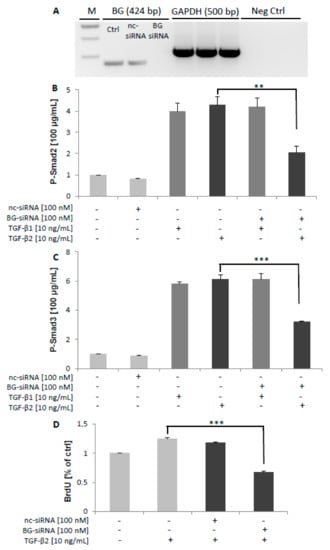 Effects of BG silencing on Smad2/3 phosphorylation in TGF-β1/2 signaling. A control RT-PCR of the knockdown effectiveness for BG was performed to ensure silencing of BG (A). The 7 × 104 93RS2 BG-silenced cells were treated with TGF-β1 or TGF-β2 (both 10 ng/mL) for 1 h. Cell lysates were analyzed for P-Smad2 and P-Smad3 by ELISAs. Silencing of BG attenuated TGF-β2 but not TGF-β1-dependent phosphorylation of Smad2 (B) and of Smad3 (C) as well as proliferation of 93RS2 cells by 47% (D). Each bar represents the mean ± SEM of 3 independent experiments performed in duplicate. Dunnett’s test was used for statistical analysis; **p < 0.01; ***p < 0.001; Ctrl, control; nc-siRNA, negative control siRNA; M, Marker; +, addition of substance; -, without addition of substance.