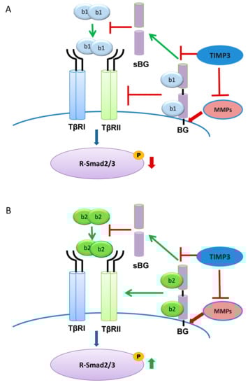 Scheme for the different modes of signaling by TGF-β1 and TGF-β2 under the influence of BG and TIMP3. (A) Normally binding of TGF-β1 (b1) to the TGF-β receptor complex results in phosphorylation of Smad3. However, TIMP3 counteracts MMP-mediated BG shedding, thus resulting in interference of membrane-bound and ligand-activated BG with the TGF-β receptor complex. This interaction attenuates TGF-β1-dependent Smad3 phosphorylation via TβRI. sBG reduces binding of TGF-β1 to the TGF-β receptor complex and thus counteracts TGF-β1 signaling. (B) In contrast, binding of TGF-β2 (b2) to BG enhances phosphorylation of TGF-β2-dependent Smad3 which is further increased when TIMP3 inhibits MMP-dependent BG shedding. sBG reduces binding of TGF-β2 to the TGF-β receptor complex and thus counteracts TGF-β2 signaling.