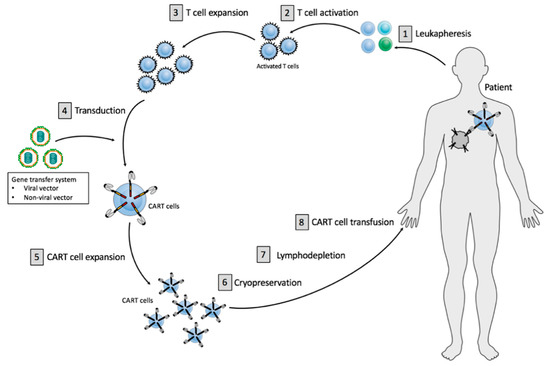 The CART cell production process comprises the initial isolation and enrichment of the T cells [1], CART cell preparation, including T cell activation [2], T cell expansion [3], gene transfer of a CAR vector while using viral or non-viral vector systems [4], followed by ex vivo CART cell expansion [5] (Figure 1). The final cell product is subjected to end-of-process formulation and cryopreservation [6] (Figure 1). Quality control testing is performed during the production as well as for the final cryopreserved CART cell product for the integrity of the product. Cancer patients usually receive a lymphodepleting treatment [7] before administration of the finally approved CART cell product [8] (Figure 1).